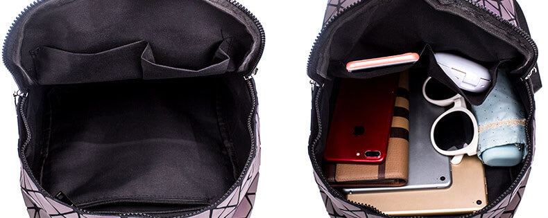 Featuring a stylish and cool geometric design that changes color 🌈 with the light, making you stand out with your unique personality. Made of high-quality materials, this backpack has a large capacity to accommodate your daily necessities such as phone, wallet, cosmetics, mini iPad, keys, and lipstick, among others.