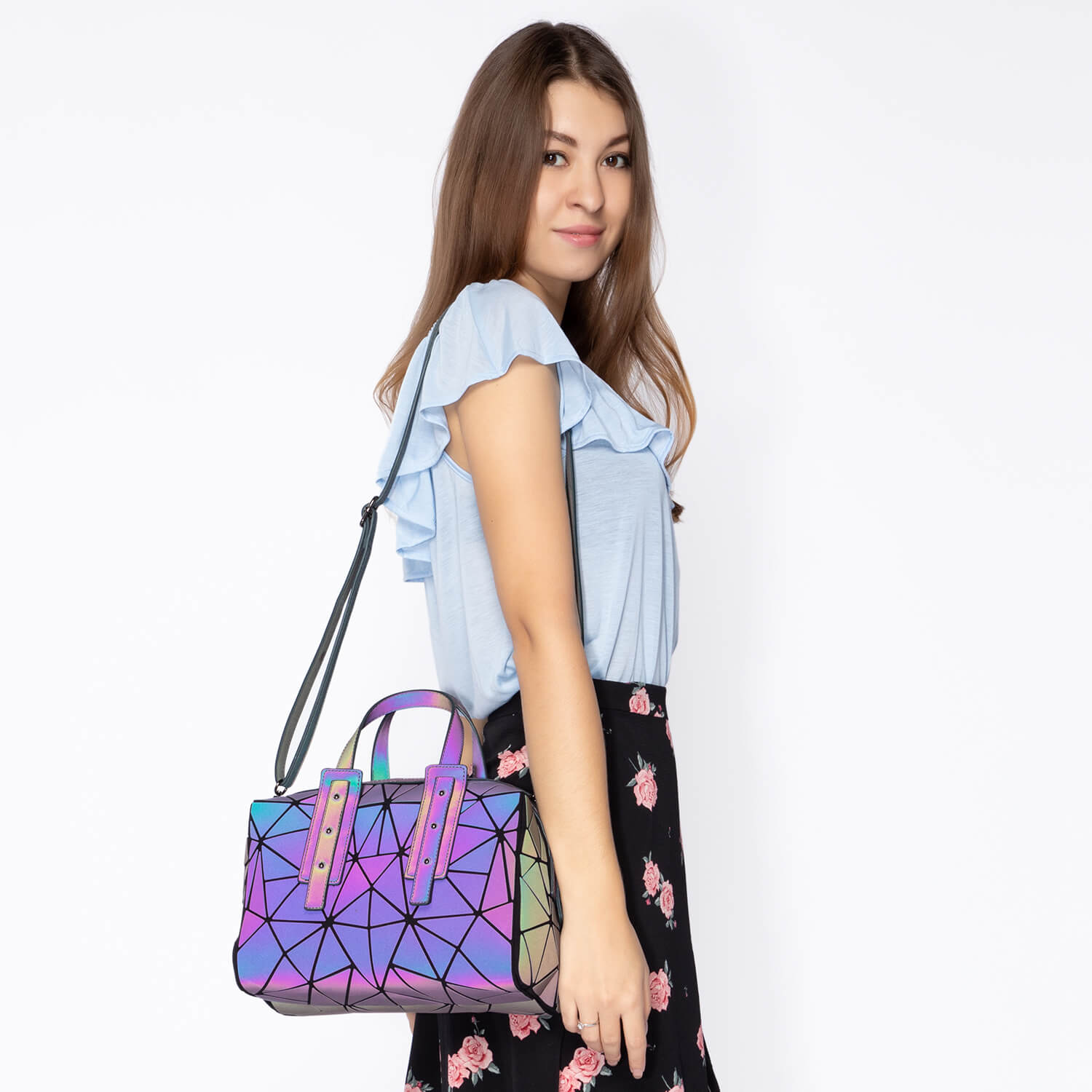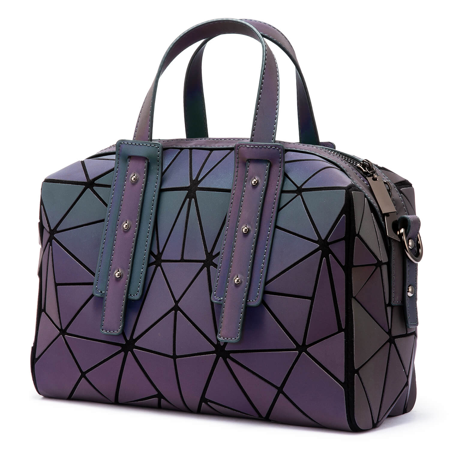 The geometric design of the bag changes colors with the light, giving it a luminous effect that is sure to turn heads.๐ Plus, with its versatile design, you can carry it as a tote or bowling bag, making it a practical choice for any occasion.